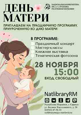 28 ноября с 15:00 до 15:45 в актовом зале библиотеки пройдет праздничный концерт артистов Дома культуры «Луч» МБУК «Дворец культуры г. о. Саранск».