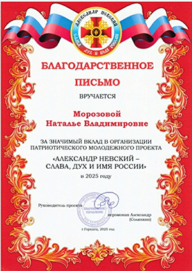 Морозову Наталью Владимировну преподавателя Саранского художественного училища имени Ф.В. Сычкова, с получением Благодарственного письма за Патриотический молодёжный проект "АЛЕКСАНДР НЕВСКИЙ-СЛАВА, ДУХ И ИМЯ РОССИИ", г.Городец 2025 год.