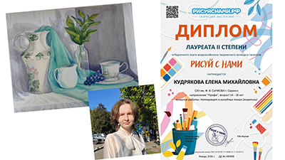 Кудрякову Елену, студентку 1 курса отделения «Живопись» Саранского художественного училища имени Ф.В. Сычкова, с получением Диплома Лауреата II степени Отборочного этапа Всероссийского творческого конкурса талантов "Рисуй с нами" направление "Профи", возраст 14-18 лет за работу «Наттюрморт в холодных тонах» (живопись).
