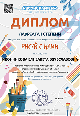 Иконникову Елизавету, студентку 1 курса отделения «Живопись» Саранского художественного училища имени Ф.В. Сычкова, с получением Диплома Лауреата I степени Отборочного этапа Всероссийского творческого конкурса талантов "Рисуй с нами" направление "Профи", возраст 14-18 лет за работу «Натюрморт в холодных тонах» (живопись).