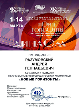 Разумовского Андрея Геннадьевича, преподавателя ГБПОУ РМ «Саранское художественное училище имени Ф.В. Сычкова», с участием в выставке Межрегионального союза русских художников «Новые горизонты» (г. Ростов-на-Дону, 2026 год).
