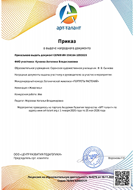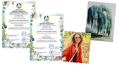 Морозову Наталью Владимировну преподавателя и Кучаеву Ангелину студентку 3 курса отделения «Живопись» Саранского художественного училища имени Ф.В. Сычкова, с получением наградного документа Международного конкурса ботанической живописи «Портрет растений» в номинации «Живопись» за работу «Ива»!