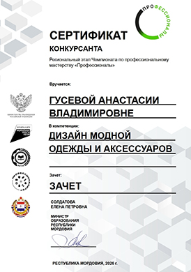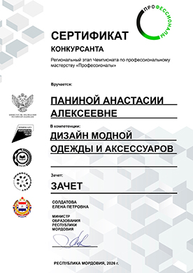Гусеву Анастасию, Панину Анастасию студенток отделения «ДПИ и НП» Саранского художественного училища имени Ф.В. Сычкова, с получением Сертификата об участии в Региональном этапе Чемпионата по профессиональному мастерству "Профессионалы" в компетенции "Дизайн модной одежды и аксессуаров".