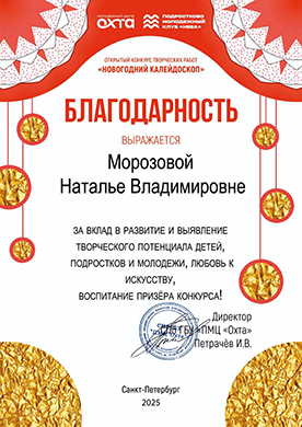Выражаем благодарность преподавателю живописи Морозовой Натальи Владимировны за вклад в развитие и выявление творческого потенциала детей, подростков и молодежи, любовь к искусству, воспитание призёра конкурса!