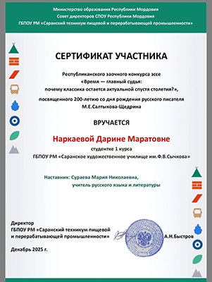 Поздравляем Наркаеву Дарину студентку Саранского художественного училища имени Ф.В. Сычков Сертификатом участника Республиканского заочного конкурса эссе "Время - главный судья!: почему классика остается актуальной спустя столетия?", посвященного 200-летию со дня рождения русского писателя М.Е.Салтыкова-Щедрина.