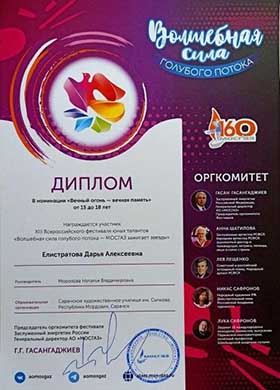 Поздравляем студентку Саранского художественного училища имени Ф.В. Сычкова Елистратову Дарью, с получением диплома в номинации «Вечный огонь - Вечная память» на XIII Всероссийском фестивале юных талантов «Волшебная сила Голубого потока — Москгаз зажигает звезды».
