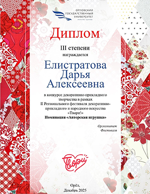 Студентка Саранского художественного училища имени Ф.В. Сычкова Елистратова Дарья получила Диплом III степени в конкурсе декоративно-прикладного творчества в рамках II Регионального фестиваля декоративно-прикладного искусства "Твори!", Номинация "Авторская игрушка".
