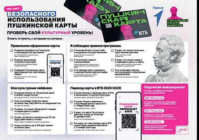 Общероссийское общественно-государственное движение детей и молодежи «Движение первых» в рамках проведения десятилетия детства в Российской Федерации подготовило памятку для самопроверки гражданами знаний по безопасному использованию карты программы «Пушкинская карта»